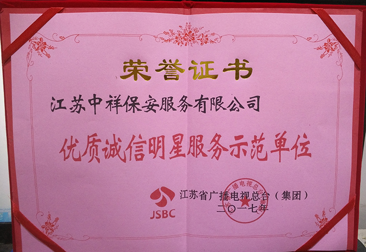 中祥保安公司榮獲江蘇省廣播電視總臺2017年優質誠信明星服務示范單位